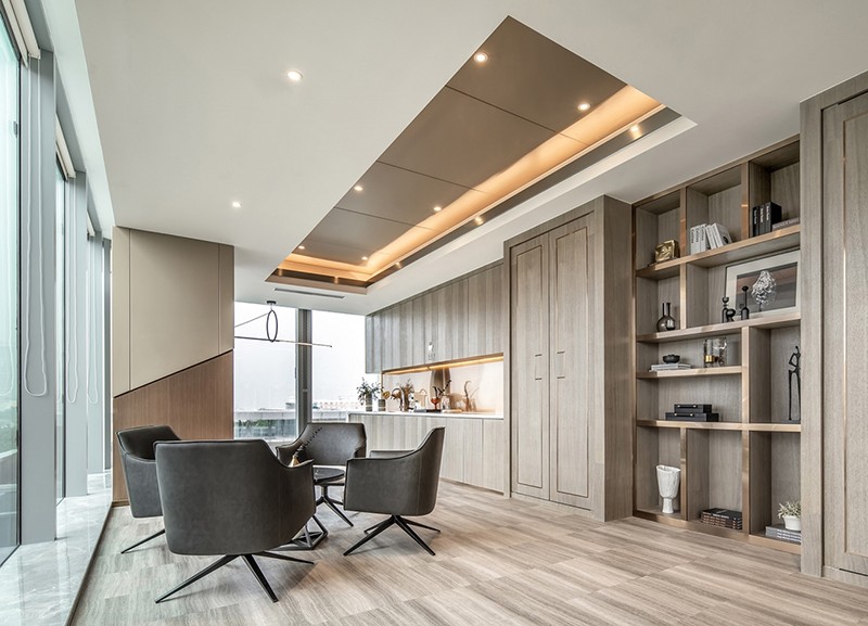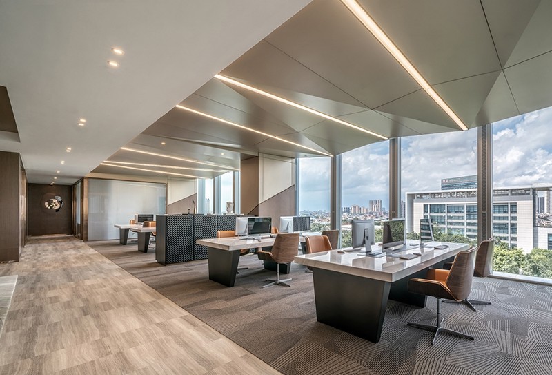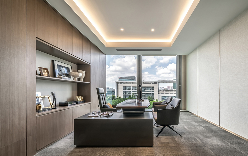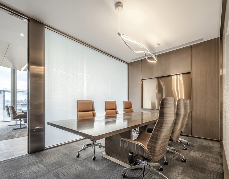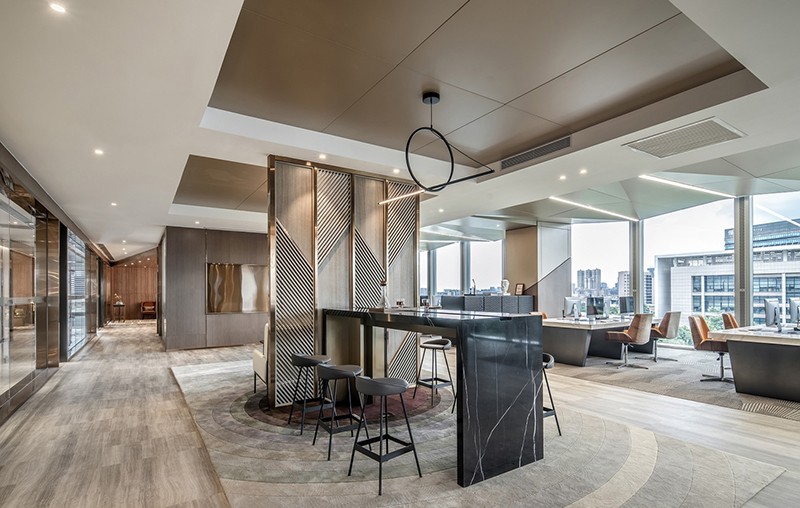 辦公空間的整體動線布局,以人為本。運用暖系色調(diào)融合啡色作為點綴,質(zhì)感豐富,對比分明,體現(xiàn)了大都會的時代感。大氣及細致并存,將建筑與藝術結(jié)合,展現(xiàn)剛?cè)岵⒅?,美觀與實用兼?zhèn)涞霓k公空間。