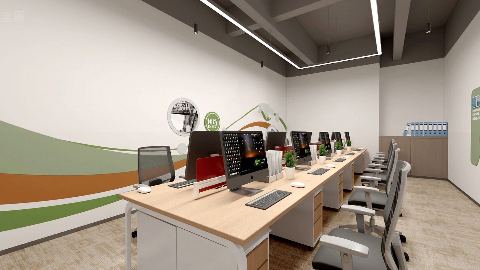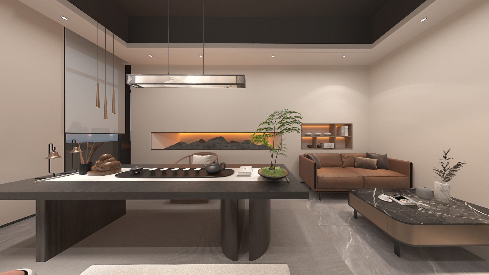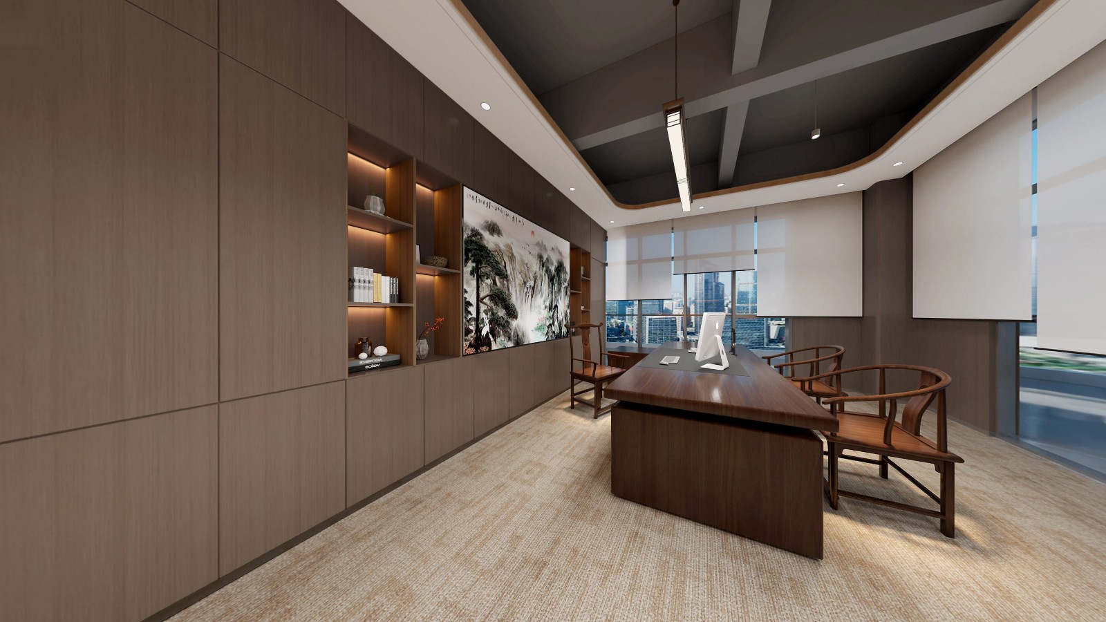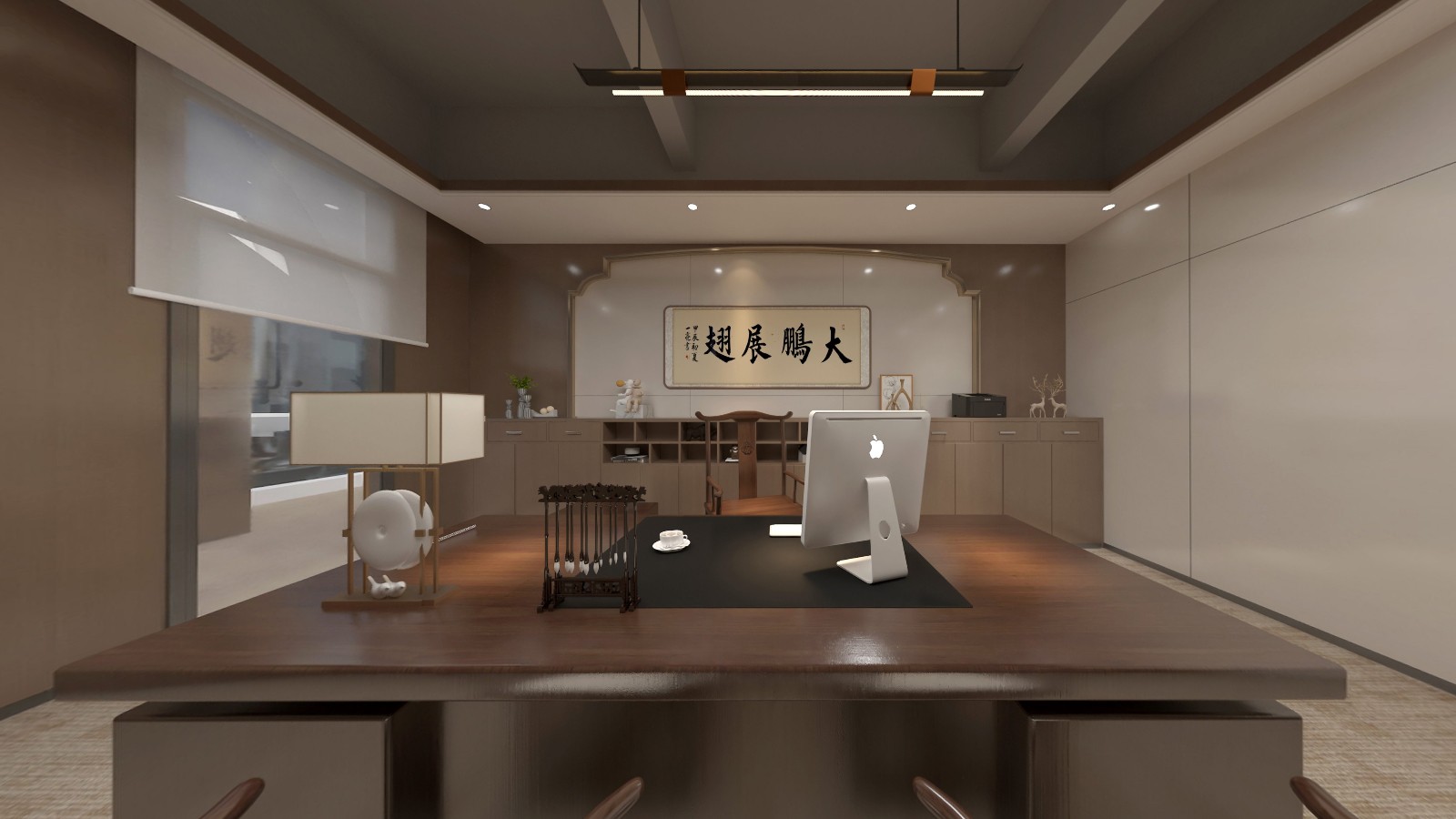 辦公區(qū)域延續(xù)采用了新中式的設計風格,簡化了繁雜的裝飾,加入了少量的幾何元素進行點綴,為古典文藝的辦公空間融入了商務元素,同時也滿足了現(xiàn)代辦公的功能性和審美需求,創(chuàng)造出一個既典雅又高效的工作環(huán)境。