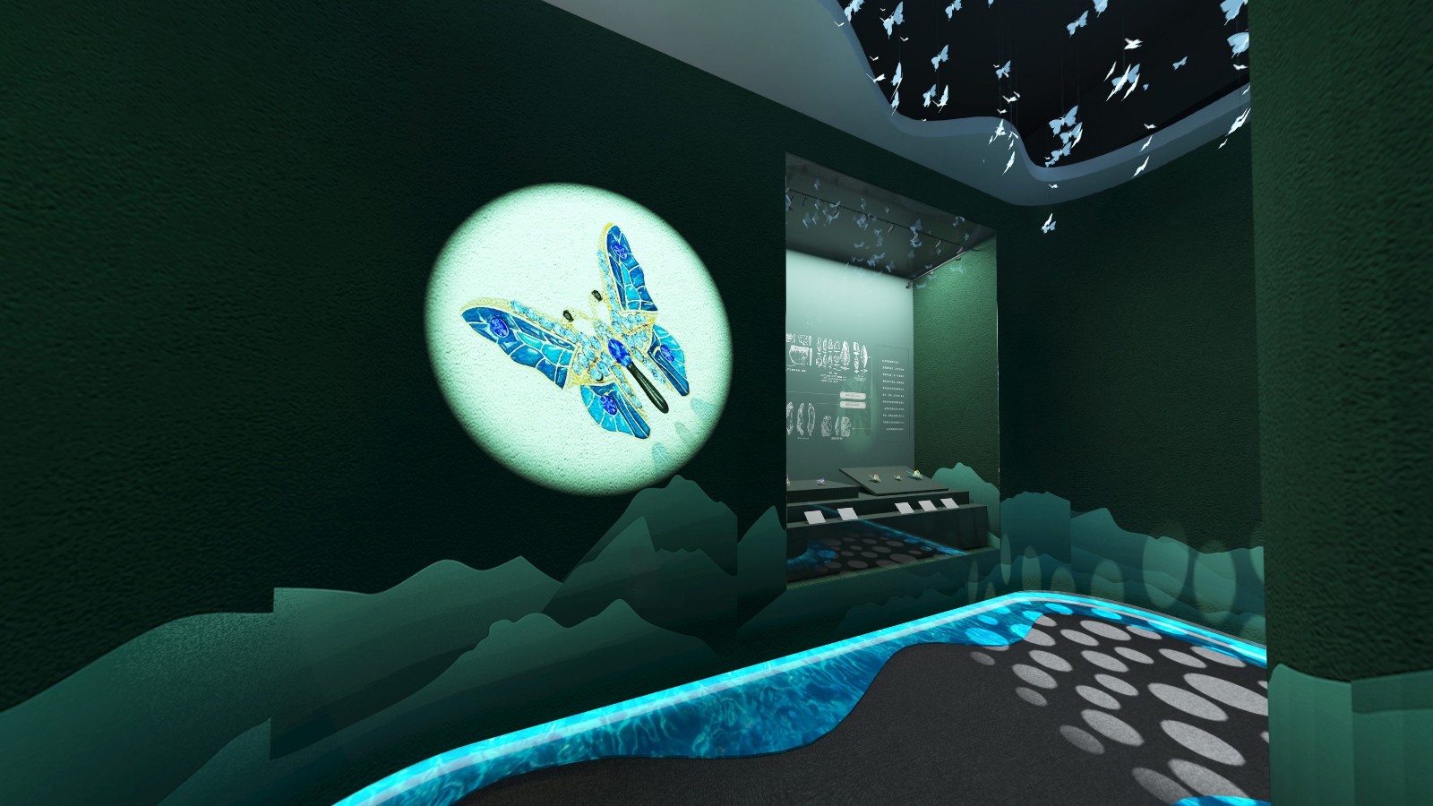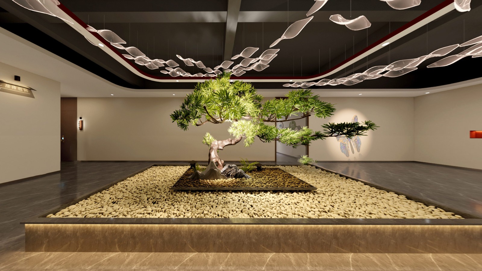 公共區(qū)域借鑒中國山水畫的意境,采用了假山、古樹、原石等造物裝飾,將山水美景移進室內,營造出與自然和諧共生的氛圍.為進入展廳做出了鋪墊。