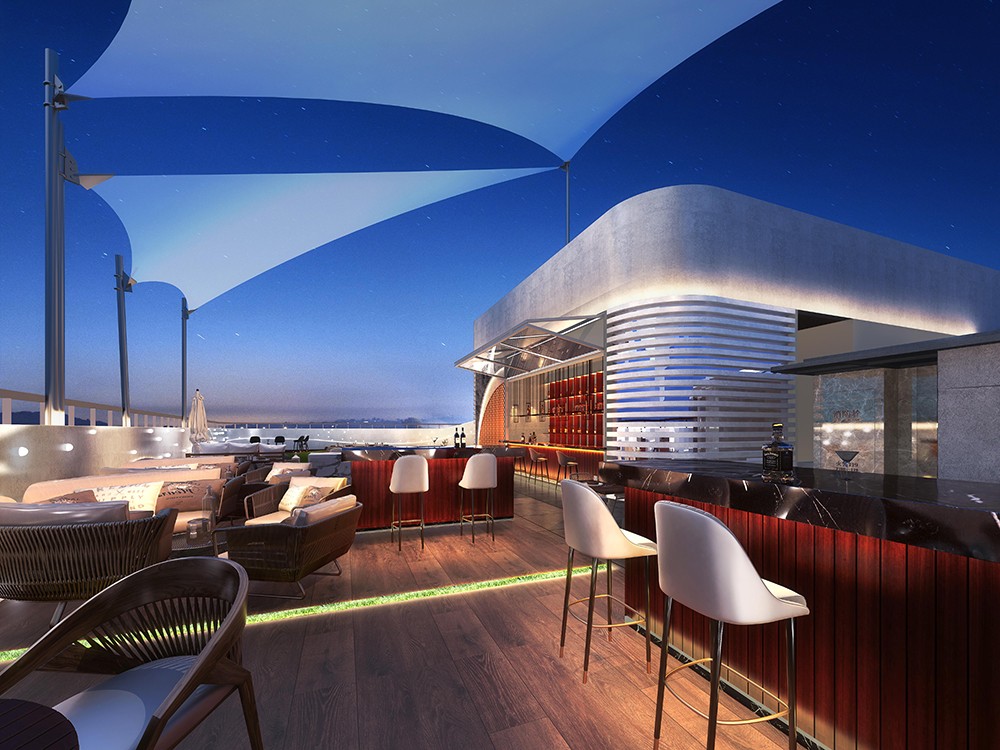 設(shè)計理念:室外開闊的明堂,水流猶如天上之水祥降而下,營造來水環(huán)繞的景觀。圍欄上跳動的線條,與天上的星空相接點點的繁星,流光似水。帶有韻味的用餐環(huán)境,以山作為背景,加上水波紋作天花,這樣可以營造一個山環(huán)水抱的祥和景象,寓意著四海朋友匯聚的地方。