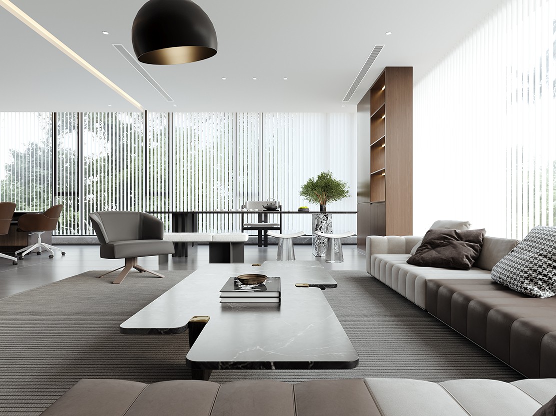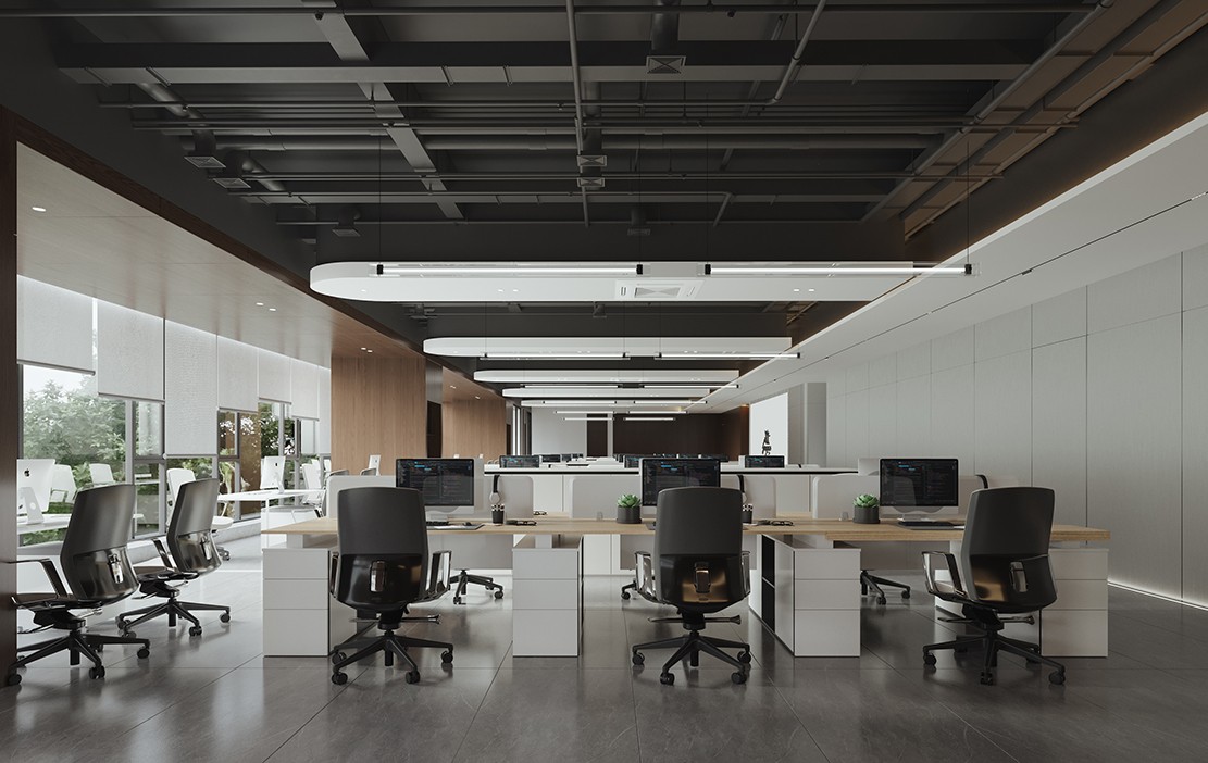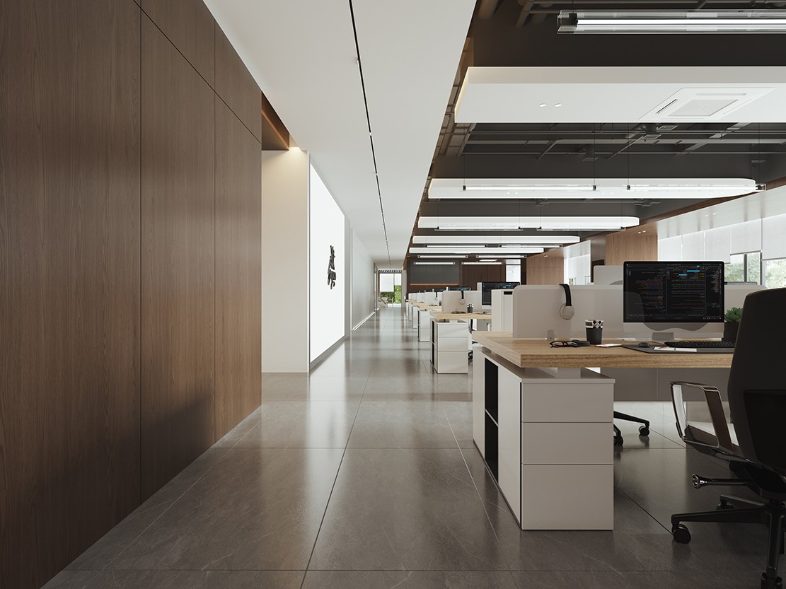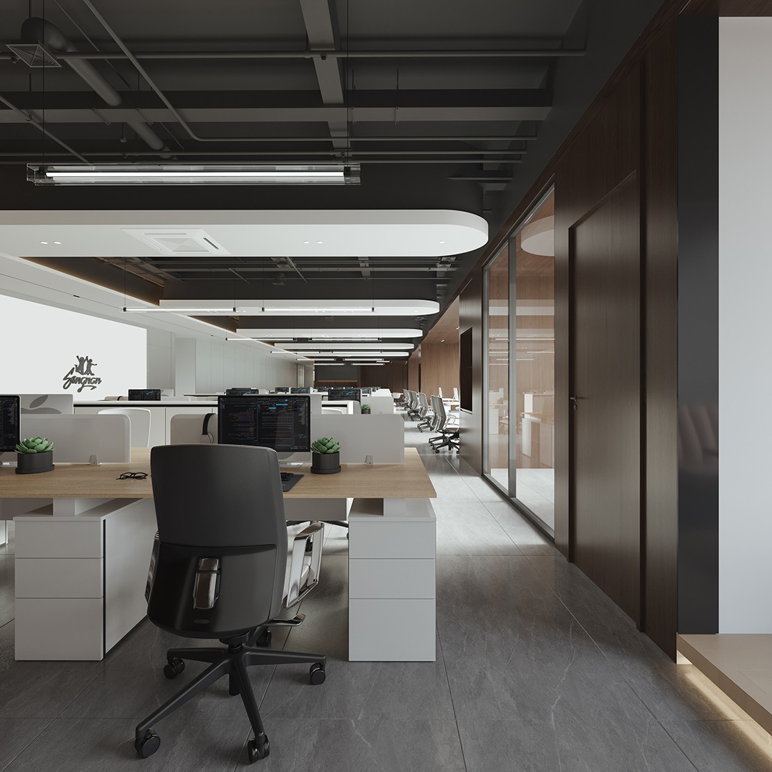 設(shè)計理念:整體空間以白色和灰色為主色調(diào),采用開放式的辦公布局,搭配金屬質(zhì)感的辦公家具和玻璃隔斷,營造出簡潔、現(xiàn)代的科技氛圍。在休息區(qū),設(shè)置了舒適的皮質(zhì)沙發(fā)和精致的茶幾,搭配暖黃色的燈光,為員工提供了一個放松身心的場所。同時,在辦公室的各個角落擺放了一些藝術(shù)雕塑和綠植,提升了空間的文化品質(zhì)和自然氣息。
