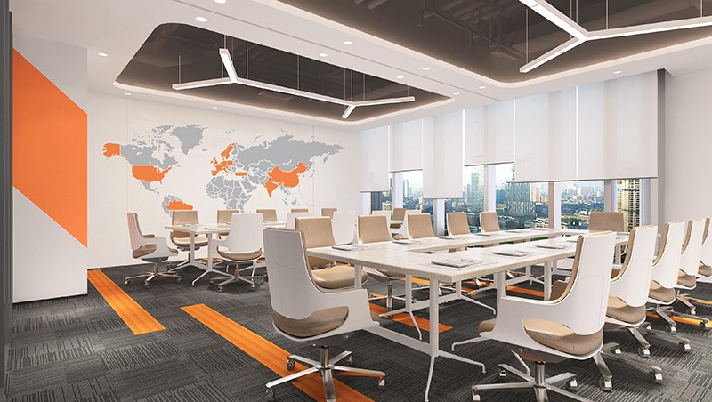 中會(huì)議室墻面配以灰色乳膠漆,簡(jiǎn)單的圖案豐富空間的層次感,使整個(gè)辦公空間色調(diào)干凈高雅;白色軟膜天花相結(jié)合的造型吊頂,形成快捷明亮舒適的室內(nèi)空間,這也是辦公室設(shè)計(jì)的功能要求所決定的。