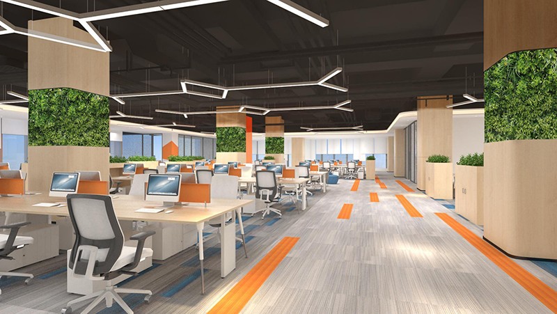 公共辦公區(qū)橫向舒展的開(kāi)放式布局給予一層空間通透且自由的氛圍,隱約之美的線(xiàn)性隔斷讓場(chǎng)景相對(duì)分隔又絕不割裂,由此顯露出交互的趣味性與工作的靈活性。