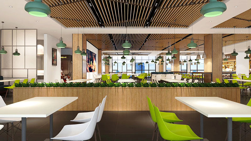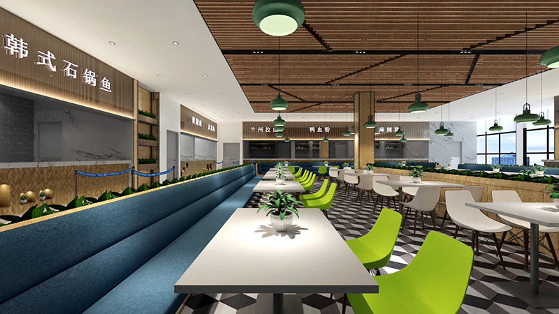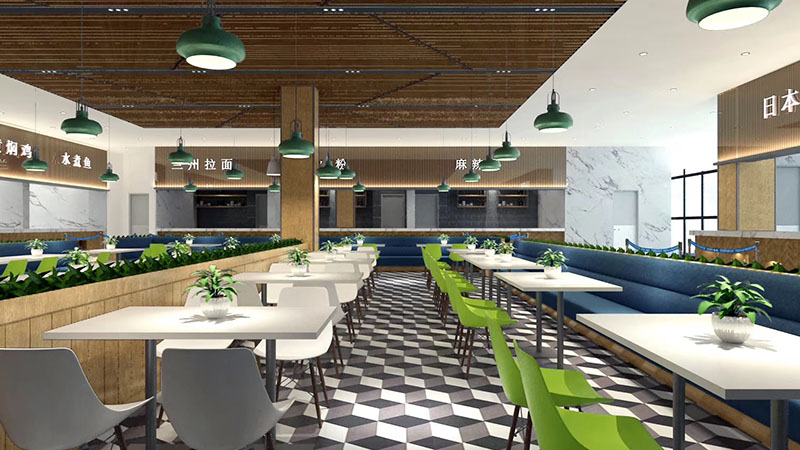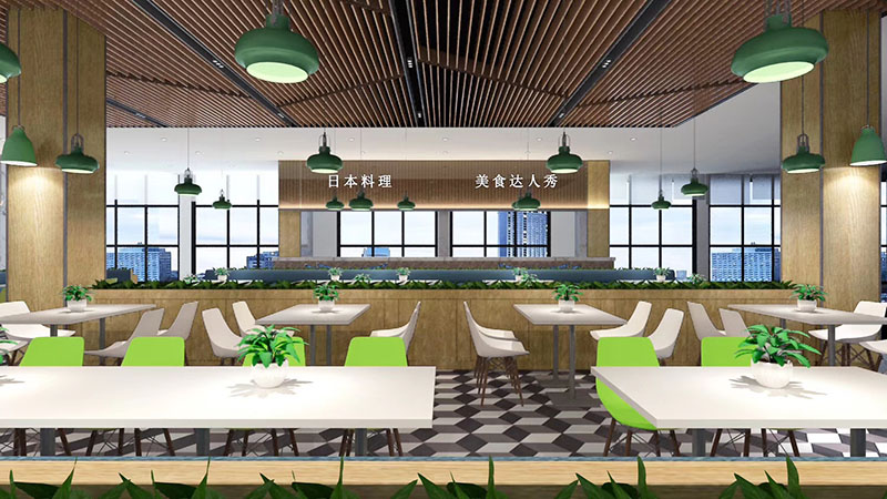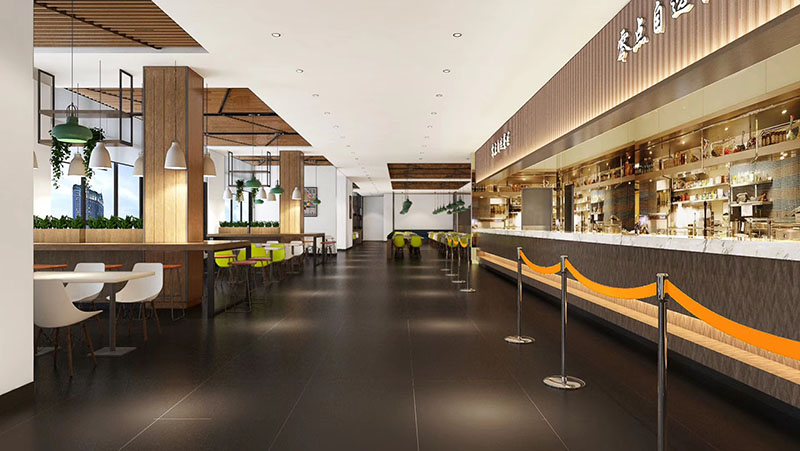 設計理念:將飲食文化與現(xiàn)代快餐空間設計相結合,打造富有內(nèi)涵的互動式空間。充分體現(xiàn)空間尺度,優(yōu)化食堂環(huán)境品質(zhì),營造健康、安全、舒適的就餐環(huán)境。