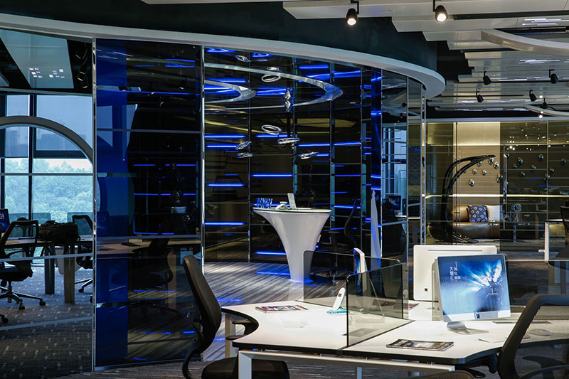 夸張、高冷,經(jīng)典黑白灰是現(xiàn)代科技風格的基本畫風,這類辦公室象征著科技、前沿、和未來感。