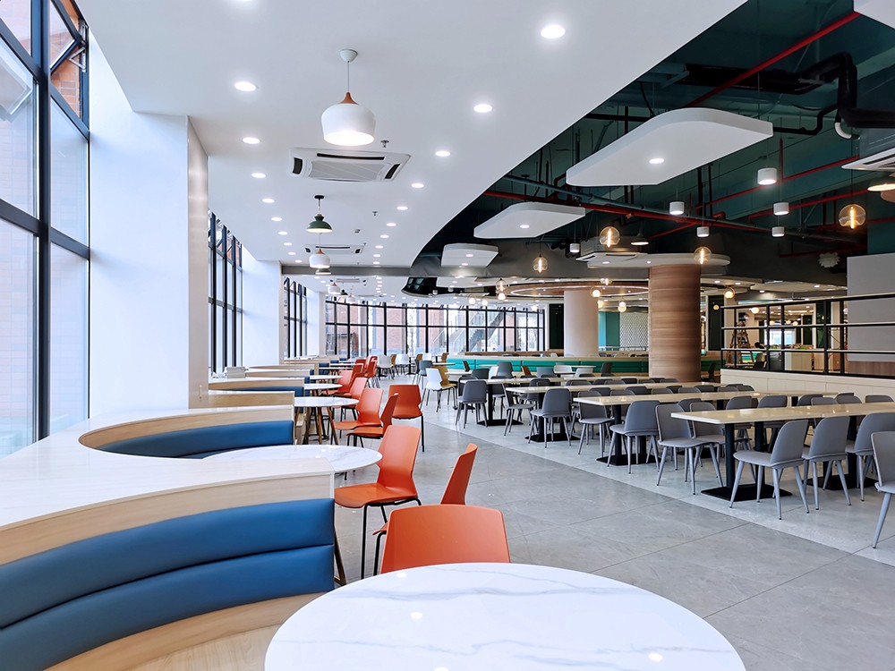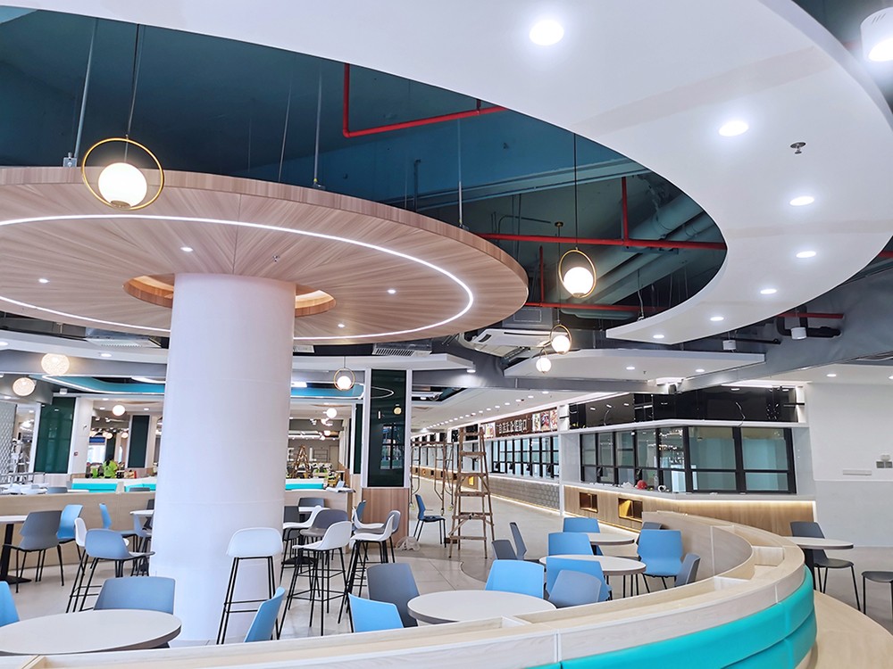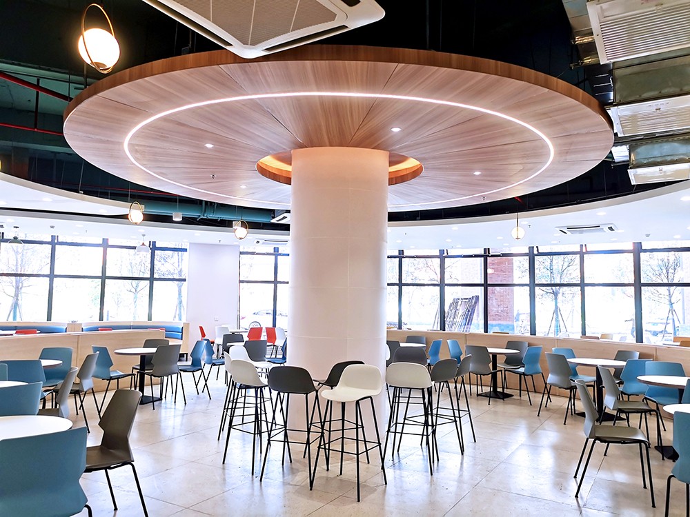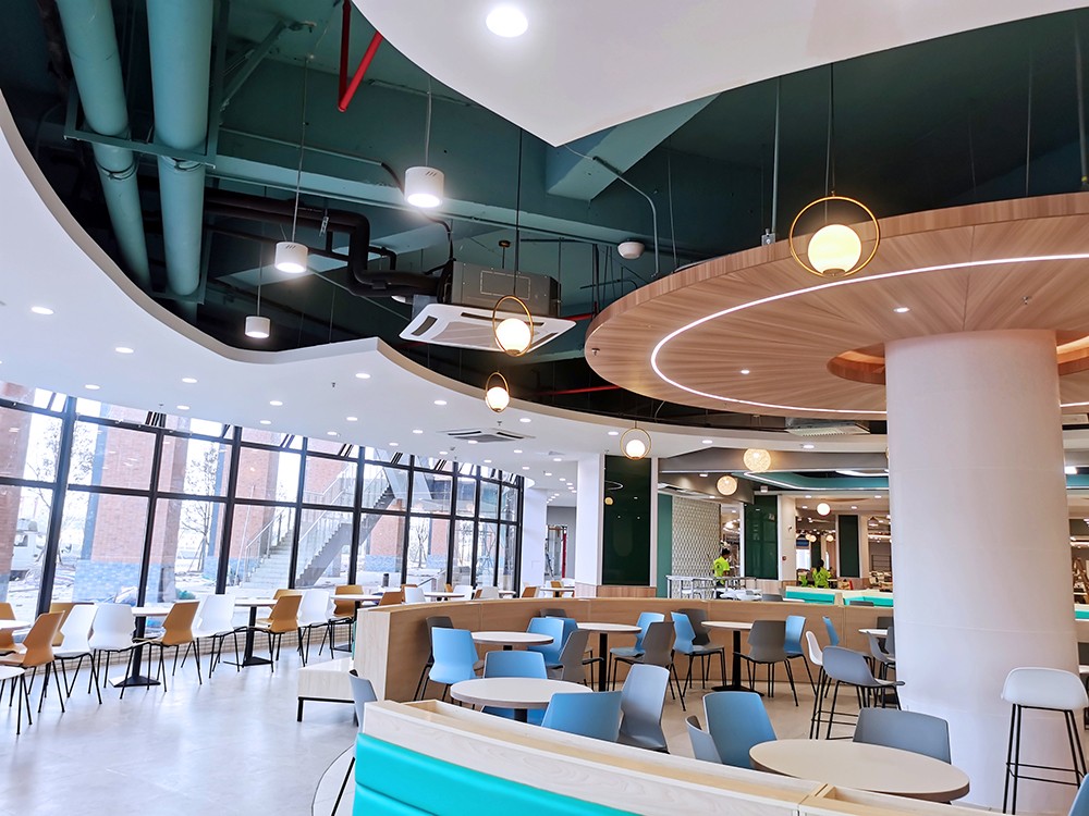設(shè)計(jì)理念:空間設(shè)計(jì)力在突破傳統(tǒng)食堂形式,表達(dá)校園食堂快樂(lè)食間品牌意識(shí),傳遞快樂(lè)食間價(jià)值觀。為學(xué)生和老師提供有品位的就餐環(huán)境,享受美食之外還具有學(xué)習(xí)、聚會(huì)、獨(dú)處的空間功能。整體空間在以白色為主基調(diào)的設(shè)計(jì)中,將天花裝飾藍(lán)色,柱子選用了一點(diǎn)墨綠色進(jìn)行點(diǎn)綴,以注入環(huán)保、科技、自然等元素,呈現(xiàn)出美感與實(shí)用兼?zhèn)涞膭?chuàng)新設(shè)計(jì)。木質(zhì)桌椅溫潤(rùn)自然,大盆綠植規(guī)律擺放,搭配錯(cuò)落有致,整個(gè)空間自然開(kāi)闊。