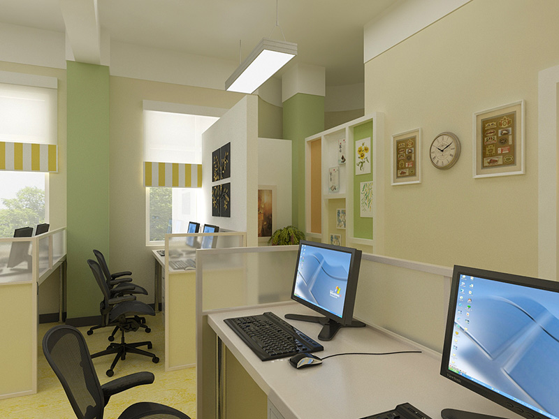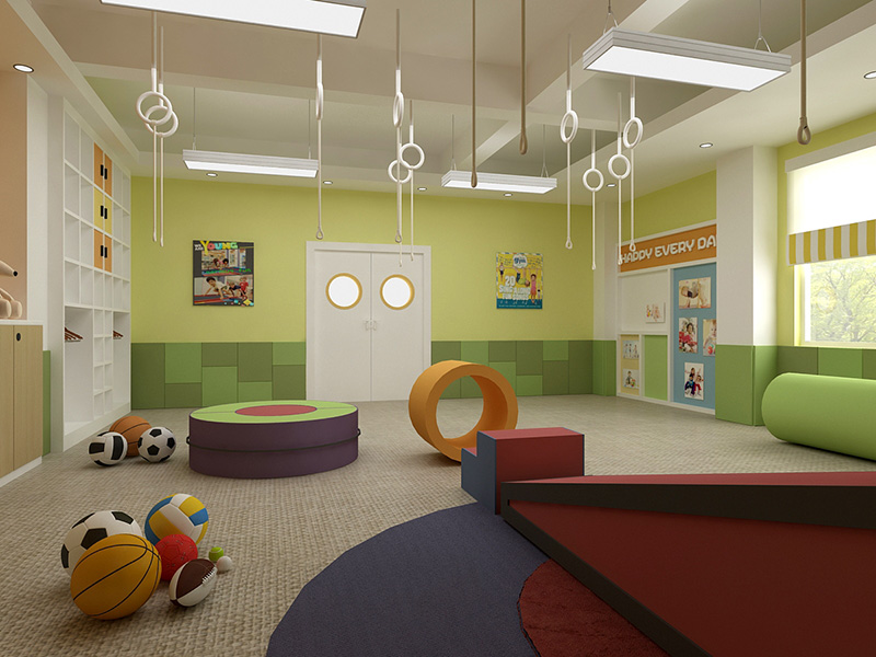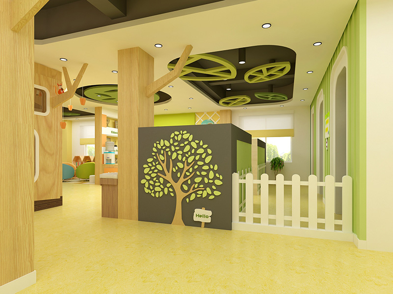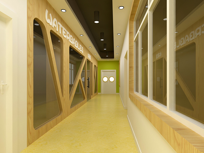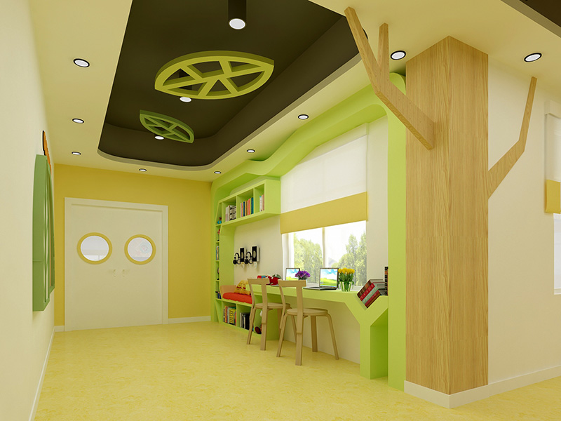 設計理念:本幼兒園設計案例基于兒童的心理及生理特點,設計師利用了顏色來表達情感。以淺橙色,蘋果綠作為主題色,分別代表了可愛柔和的親切感,活力明快的健康成長,清爽積極的探索思考。再加入了原木色的家具及柜體,使得整個空間在光線的映襯下顯得柔和,自然。大面積使用了原木墻板及原木假梁,這種秩序和結構的關系對幼小的孩子充滿了啟發(fā)性。